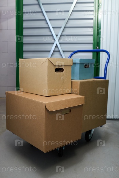 Накопленные картонные коробки на Dolly Cart, стоящие внутри хранилища
