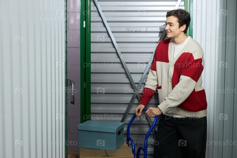 Молодой человек улыбается, перемещая коробки с ручным грузовиком в хранилище