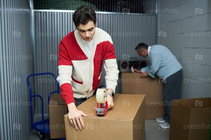Молодой человек запечатывает картонную коробку, в то время как мужчина среднего возраста собирает вещи