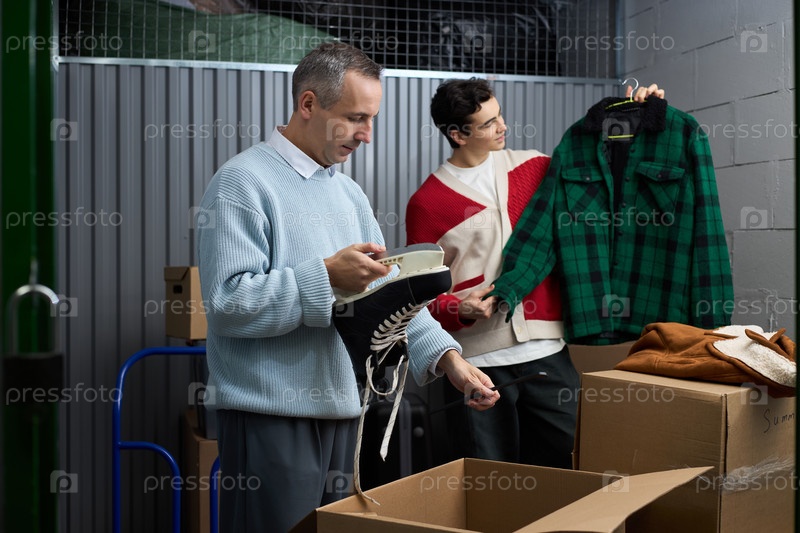 Мужчина среднего возраста и молодой взрослый мужчина сортируют одежду в хранилище