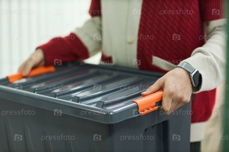 Мужчина средних лет несет пластиковый контейнер для хранения в помещении