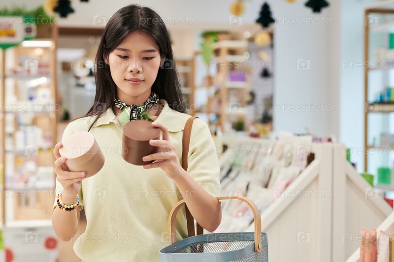 Молодая азиатская женщина сравнивает косметические продукты во время покупок в магазине