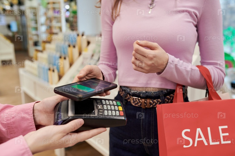 Молодая женщина делает бесконтактные платежи с помощью смартфона в магазине