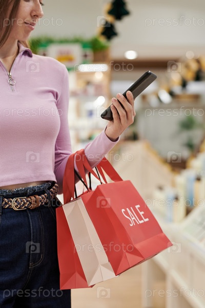 Молодая женщина держит сумки для покупок, используя смартфон в помещении