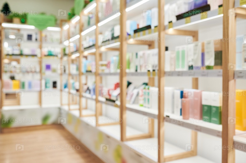 Фармацевтические полки, на которых отображаются различные продукты по уходу за кожей и здоровьем в помещении