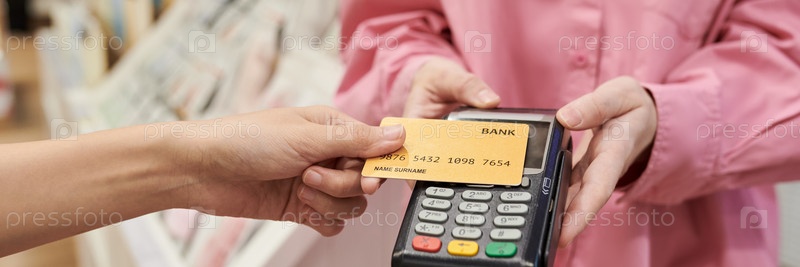 Молодая женщина обрабатывает оплату кредитной картой при оформлении