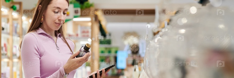 Молодая женщина читает этикетку продукта, держа цифровой планшет