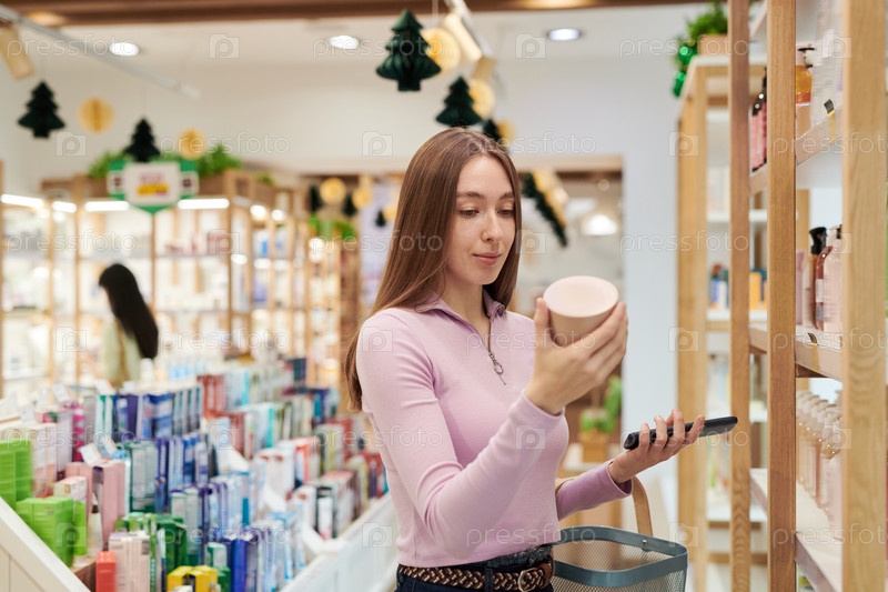 Молодая женщина сравнивает продукты по уходу за кожей во время покупок в магазине