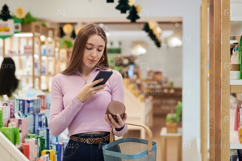Молодая женщина сравнивает информацию о продукте с помощью смартфона во время покупок