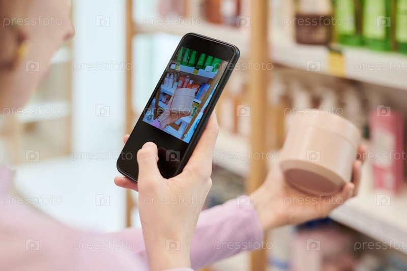 Молодая женщина сравнивает информацию о продукте с помощью смартфона