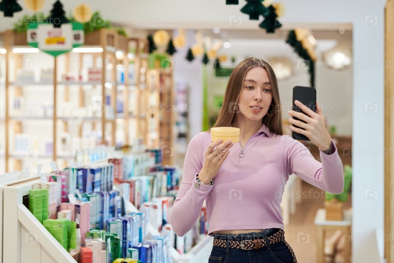 Молодая женщина снимает видеоблог, содержащий косметический продукт в магазине