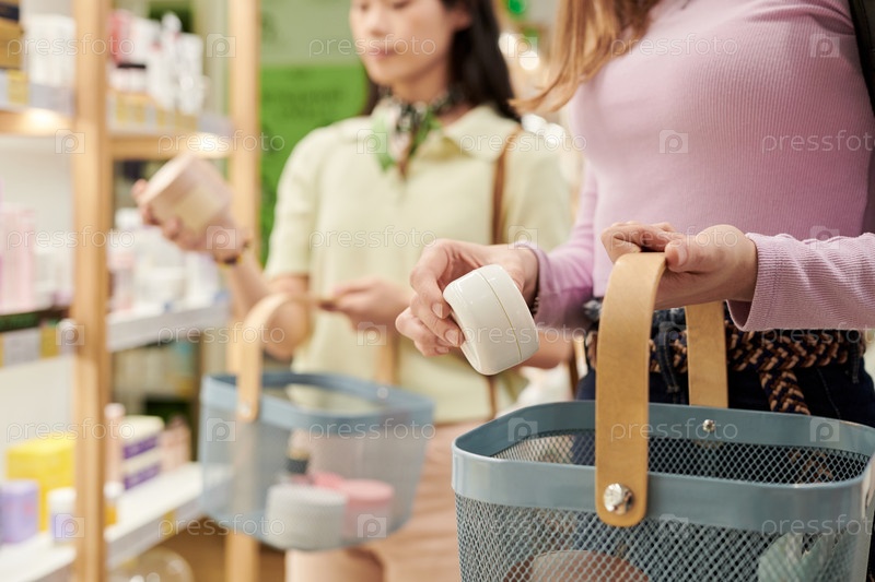 Молодые азиатские женщины покупают средства по уходу за кожей в магазине красоты