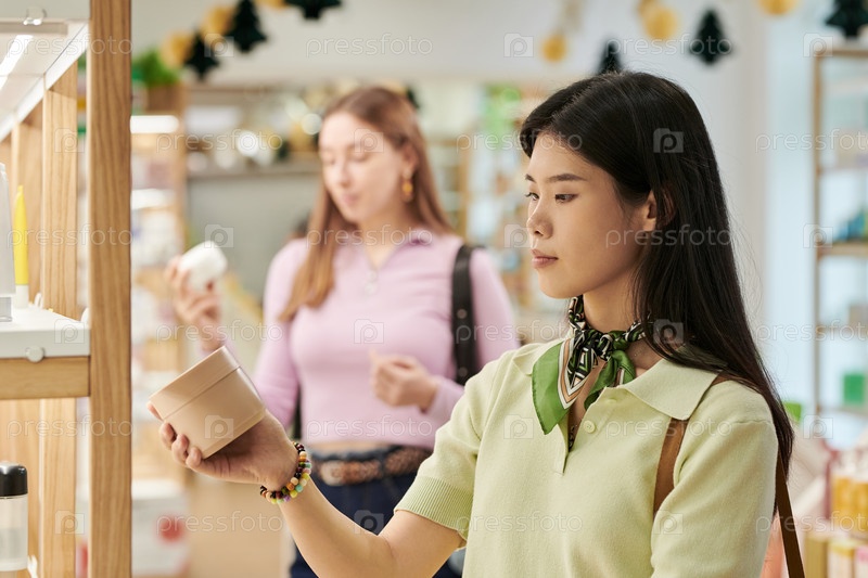 Молодая азиатская женщина изучает продукт во время покупок в магазине с другом поблизости