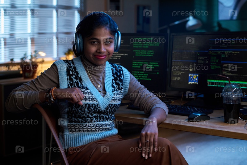 Портрет молодой южноазиатской женщины, носящей наушники и работающей на компьютере