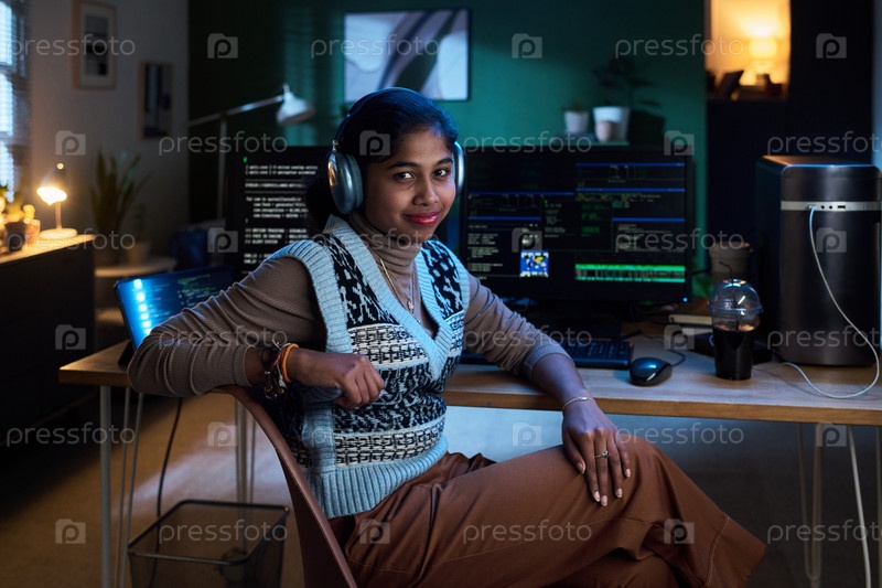 Портрет молодой южноазиатской женщины, слушающей музыку во время программирования
