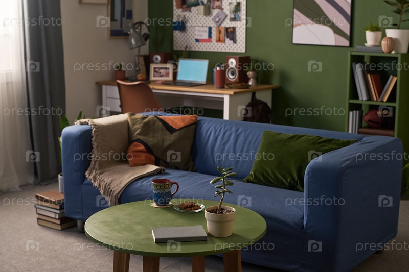 Интерьер гостиной с уютным диваном и рабочим пространством для домашнего офиса