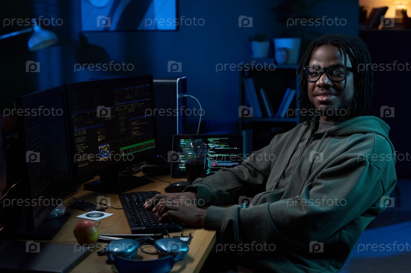 Портрет молодого чернокожего человека, программирующего на компьютере за рабочим столом в темном офисе
