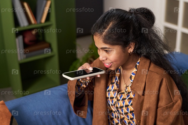 Молодая южноазиатская женщина использует голосовой помощник смартфона в помещении