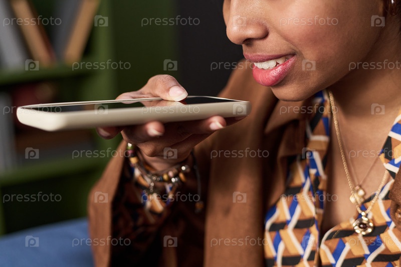 Молодая индийская женщина использует голосовой помощник смартфона для общения