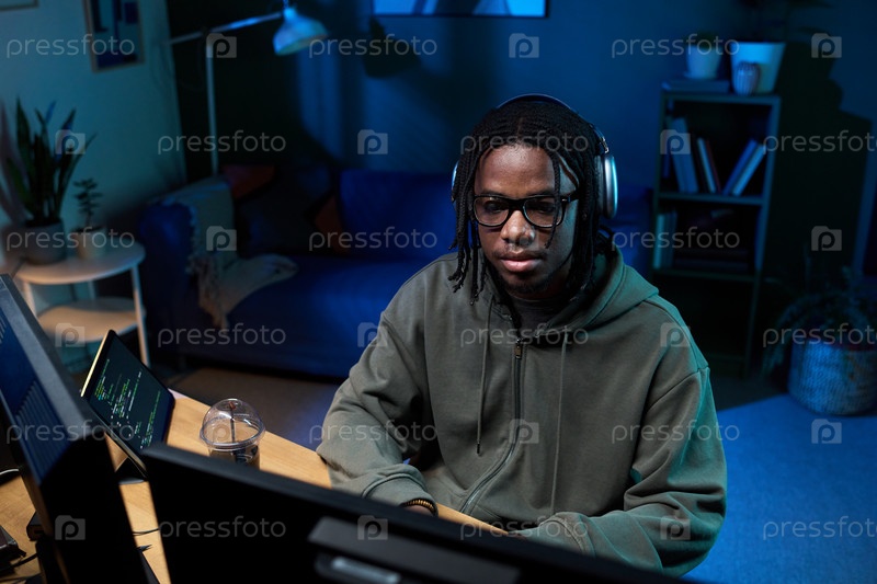 Молодой чернокожий мужчина, носящий наушники, кодирует на компьютере в домашнем офисе ночью