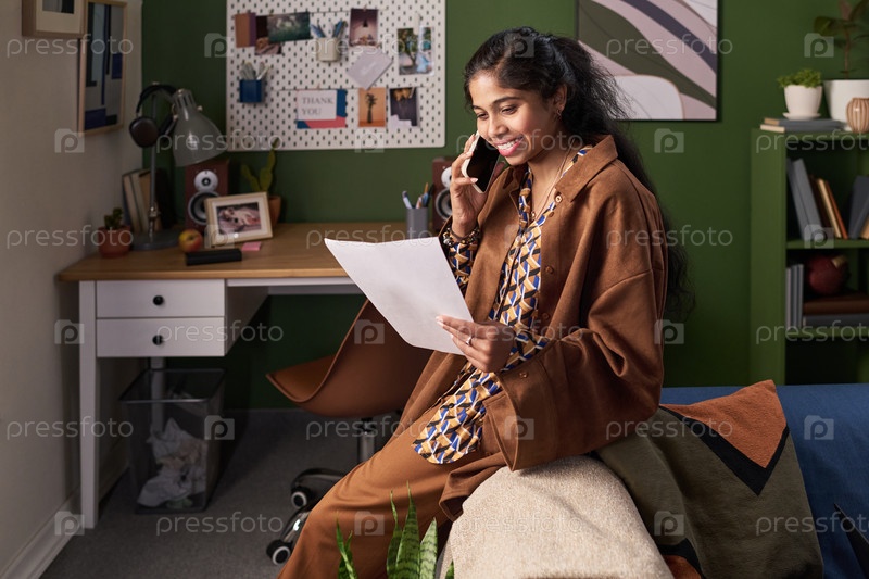 Молодая южноазиатская женщина улыбается, разговаривая по телефону и читая документ