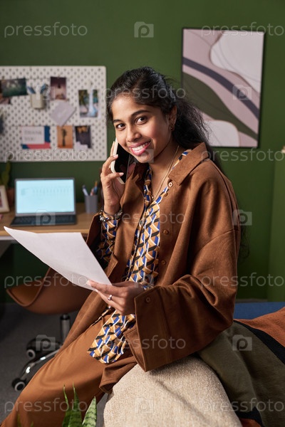 Портрет молодой южноазиатской женщины, улыбающейся во время разговора по телефону