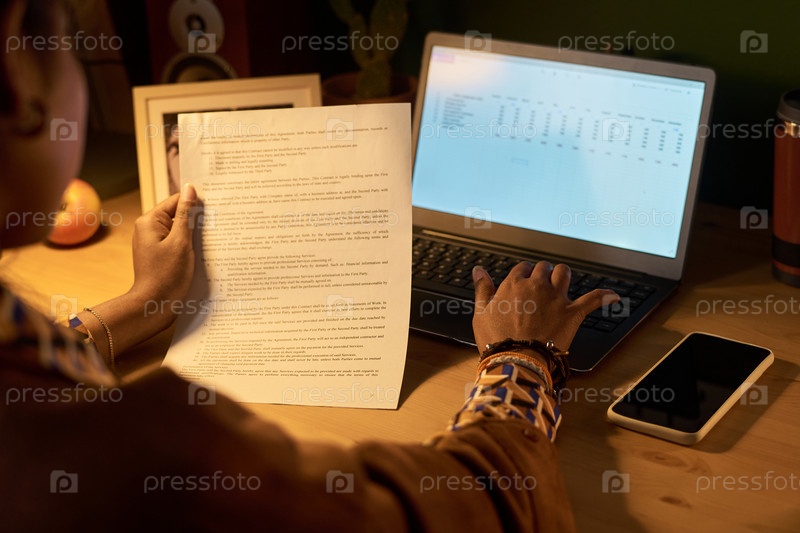 Женщина просматривает документ, работая на ноутбуке