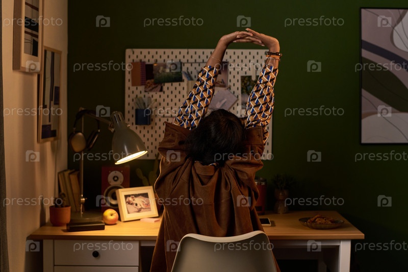 Молодая женщина растягивает руки, сидя за рабочим столом