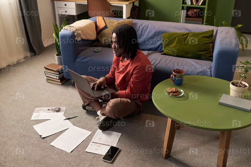 Молодой чернокожий мужчина сидит на полу, используя ноутбук и изучая документы
