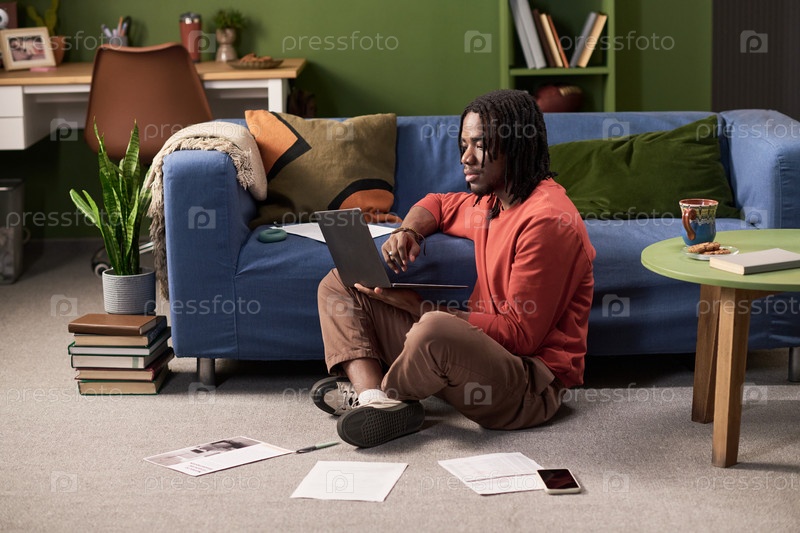 Молодой чернокожий мужчина сидит на полу, используя ноутбук для удаленной работы