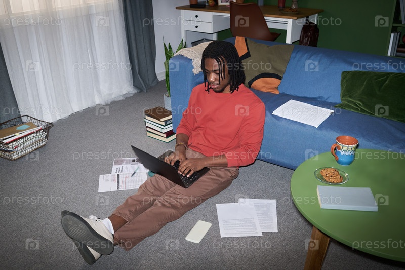 Молодой чернокожий мужчина сидит на полу, работая с ноутбуком дома