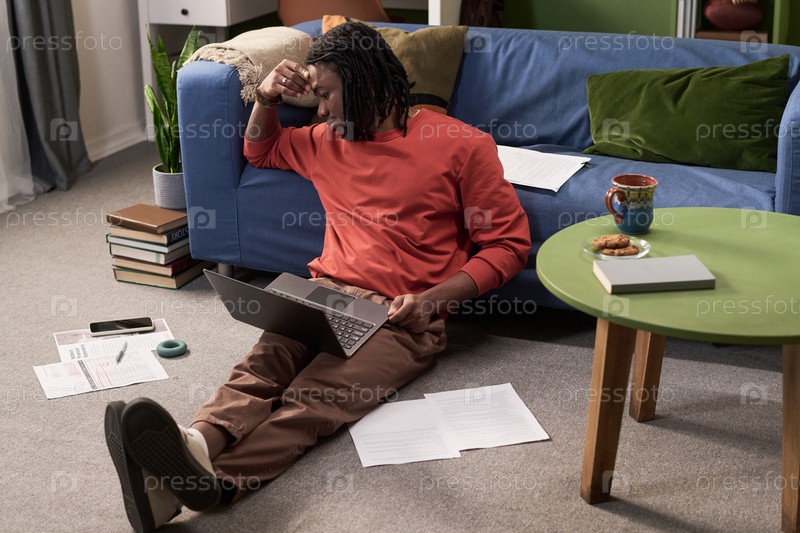 Молодой чернокожий мужчина сидит на полу и учится с ноутбуком, выглядящий напряженным