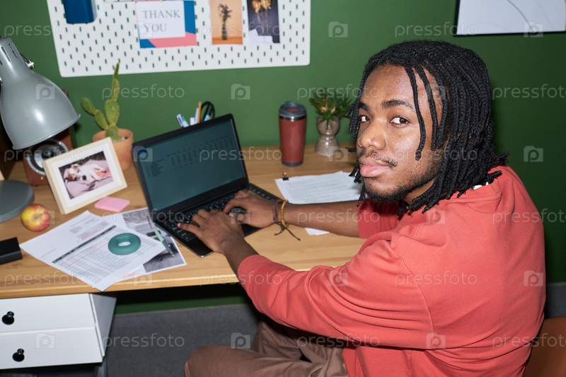 Портрет молодого чернокожего мужчины, работающего на ноутбуке у домашнего офиса