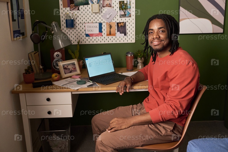 Портрет молодого чернокожего мужчины, улыбающегося во время работы в домашнем офисе