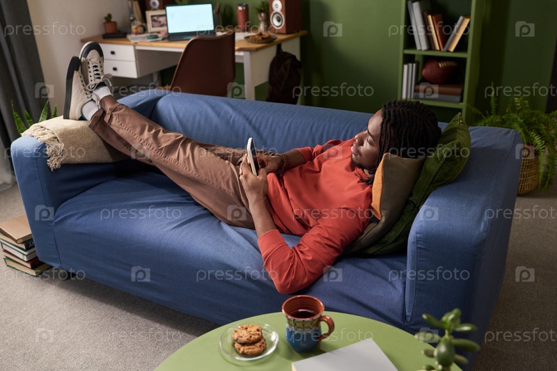 Молодой чернокожий мужчина отдыхает на диване, просматривая смартфон дома