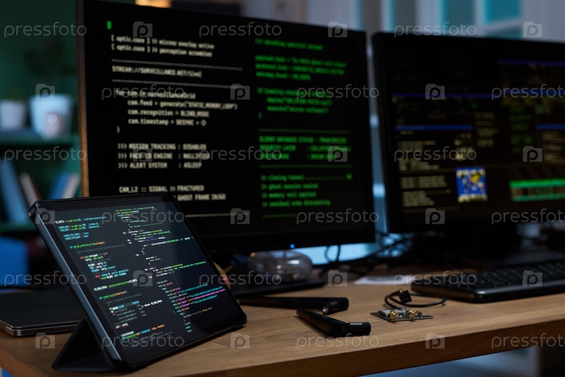 Ближайшее изображение планшетов и мониторов, отображающих программный код в Office