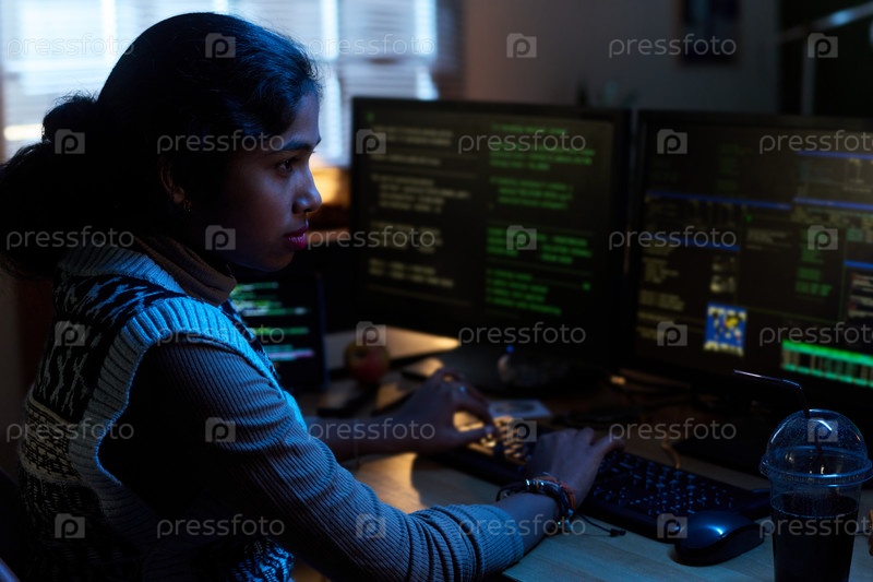Молодая южноазиатская женщина работает на компьютерных мониторах в темном офисе
