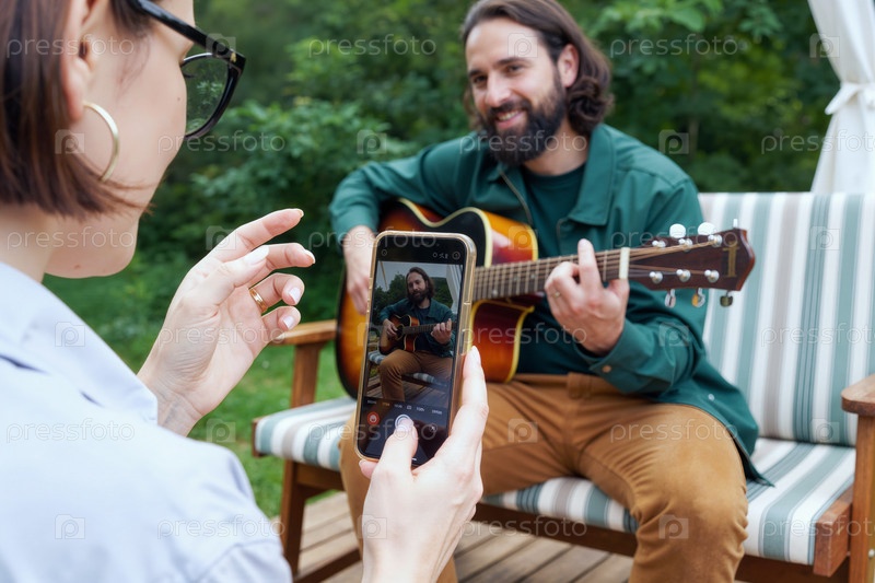 Белый мужчина играет на гитаре снаружи, в то время как молодая женщина записывает видео