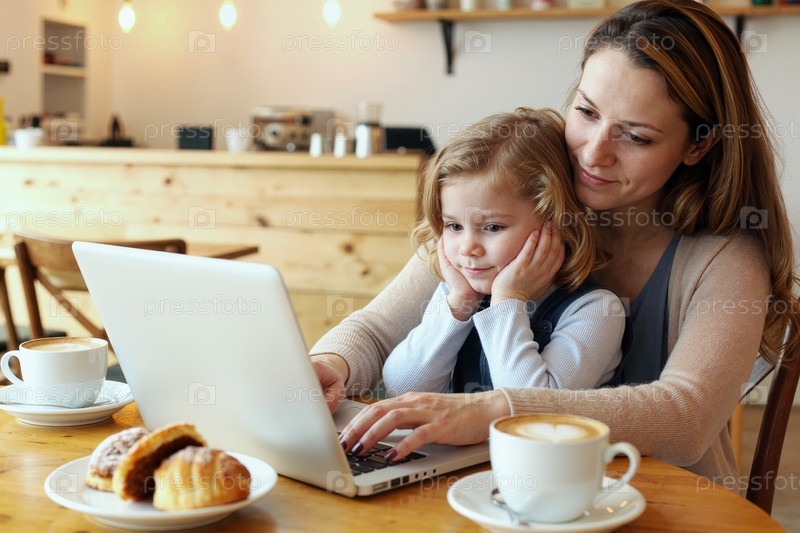 Кавказская молодая взрослая женщина обучает кавказского ребенка девочке использовать ноутбук в кафе