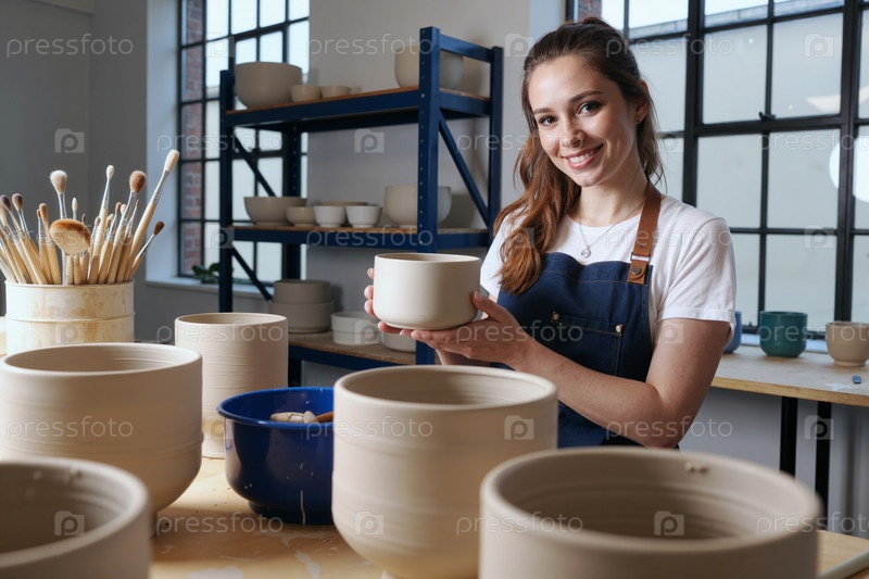 Портрет молодой взрослой белокожей женщины, держащей керамическую чашу в студии гончарного дела