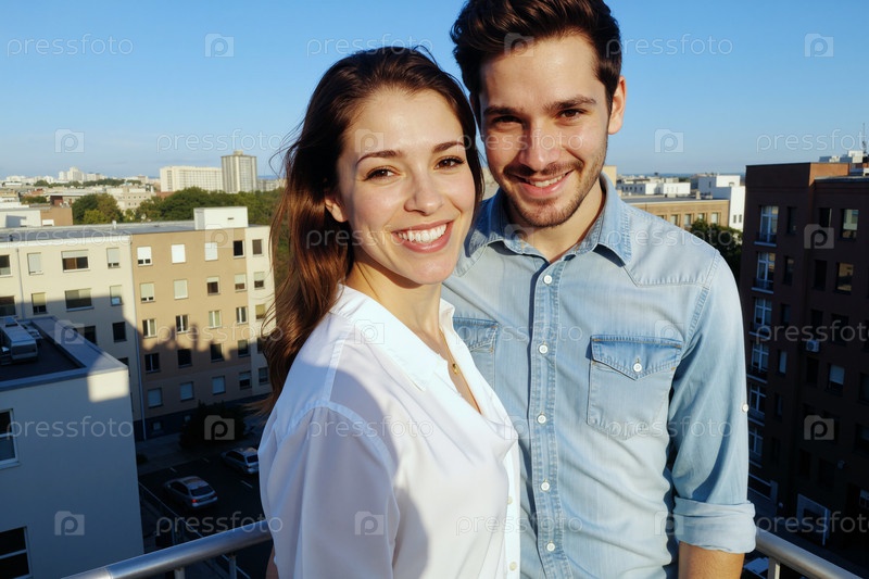 Портрет молодой белокожей женщины и мужчины, улыбающихся вместе на открытом воздухе