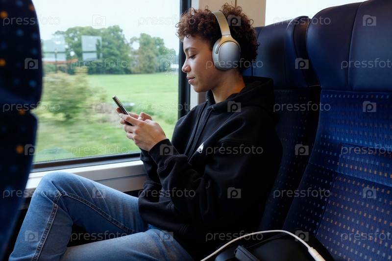 Молодая чернокожая женщина слушает музыку и пользуется смартфоном в поезде