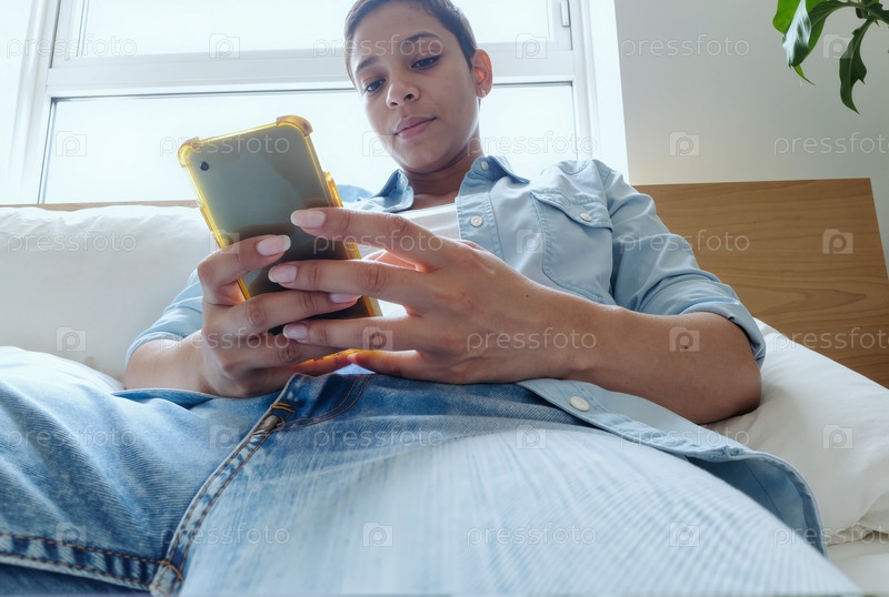 Молодая взрослая чернокожая женщина сидит в помещении, используя смартфон и расслабляясь