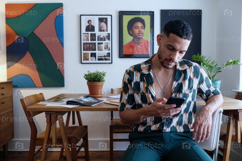 Молодой взрослый белый мужчина сидит за столом, используя смартфон в помещении