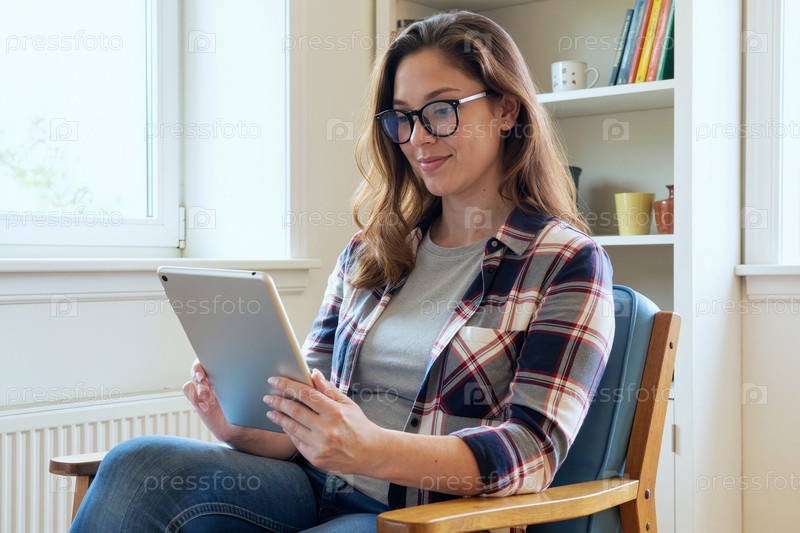 Кавказская молодая взрослая женщина использует цифровой планшет, сидя в помещении