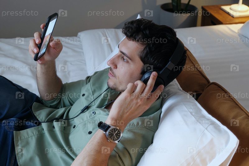 Молодой взрослый белый мужчина слушает музыку на наушниках с помощью смартфона