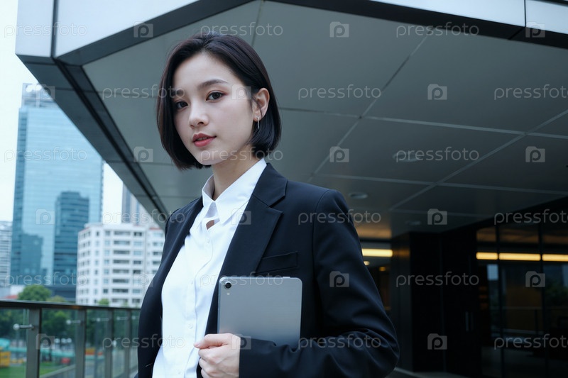 Портрет молодой взрослой азиатской женщины, держащей планшет Стоя на улице уверенно