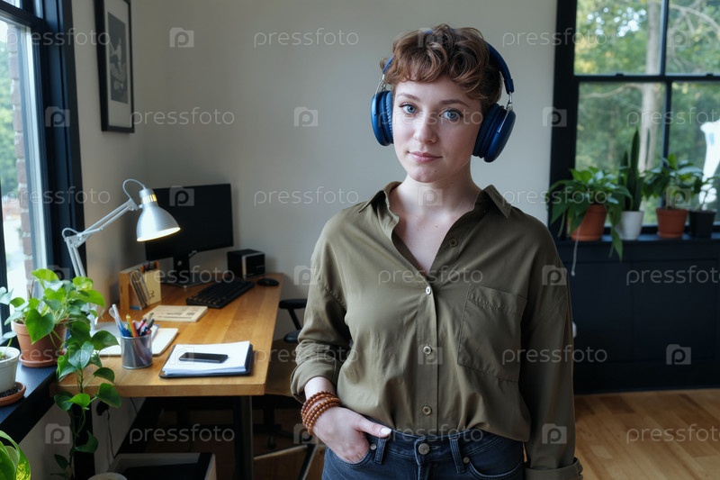 Портрет молодой взрослой белокожей женщины с наушниками, стоящей в офисе