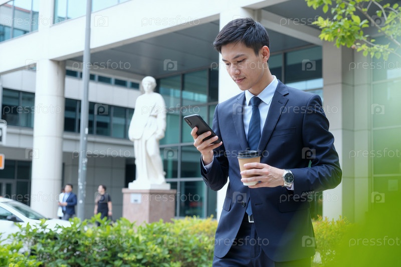 Молодой взрослый азиатский мужчина ходит на улице проверяет смартфон держит кофе