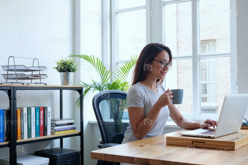 Молодая взрослая азиатская женщина работает удаленно, пьет кофе в помещении